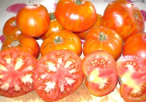 Variété issue d’un croisement entre « Red Brandywine » et « Ananas », sélectionnée par Didier Meunier, France. Variété de mi- saison. Fruit jaune orangée marbrée de rouge de 150 à 300 g, voire plus, de type beefsteak. Chair dense et juteuse. Saveur excellente et douce. Très bonne. Très bonne résistance à l’éclatement.
