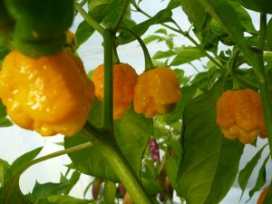 Originaire du district Moruga dans l’état de Trinité-et-Tobago, le piment Trinidad Moruga Scorpion jaune est un des piments les plus forts sur l’échelle de Scoville avec ses 1.2-2 millions d’unités aux côtés du piment Trinidad Scorpion. Nonobstant sa chaleur, c’est un piment qui offre une explosion de goûts pour les amateurs avertis. Les plants prolifiques produisent des fruits à la peau bosselée qui virent du vert au jaune en mûrissant.